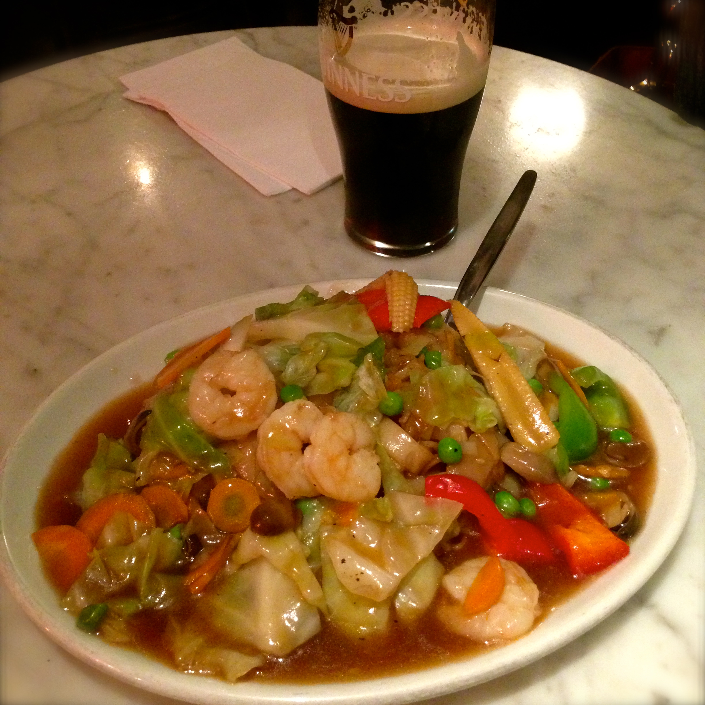 Rad Na: Fried thick noodles topped with gravy and green vegetables