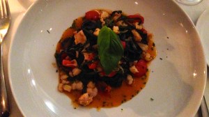 Linguini al nero di seppia con rana pescatrice, pomodori ciliegino e zucchine