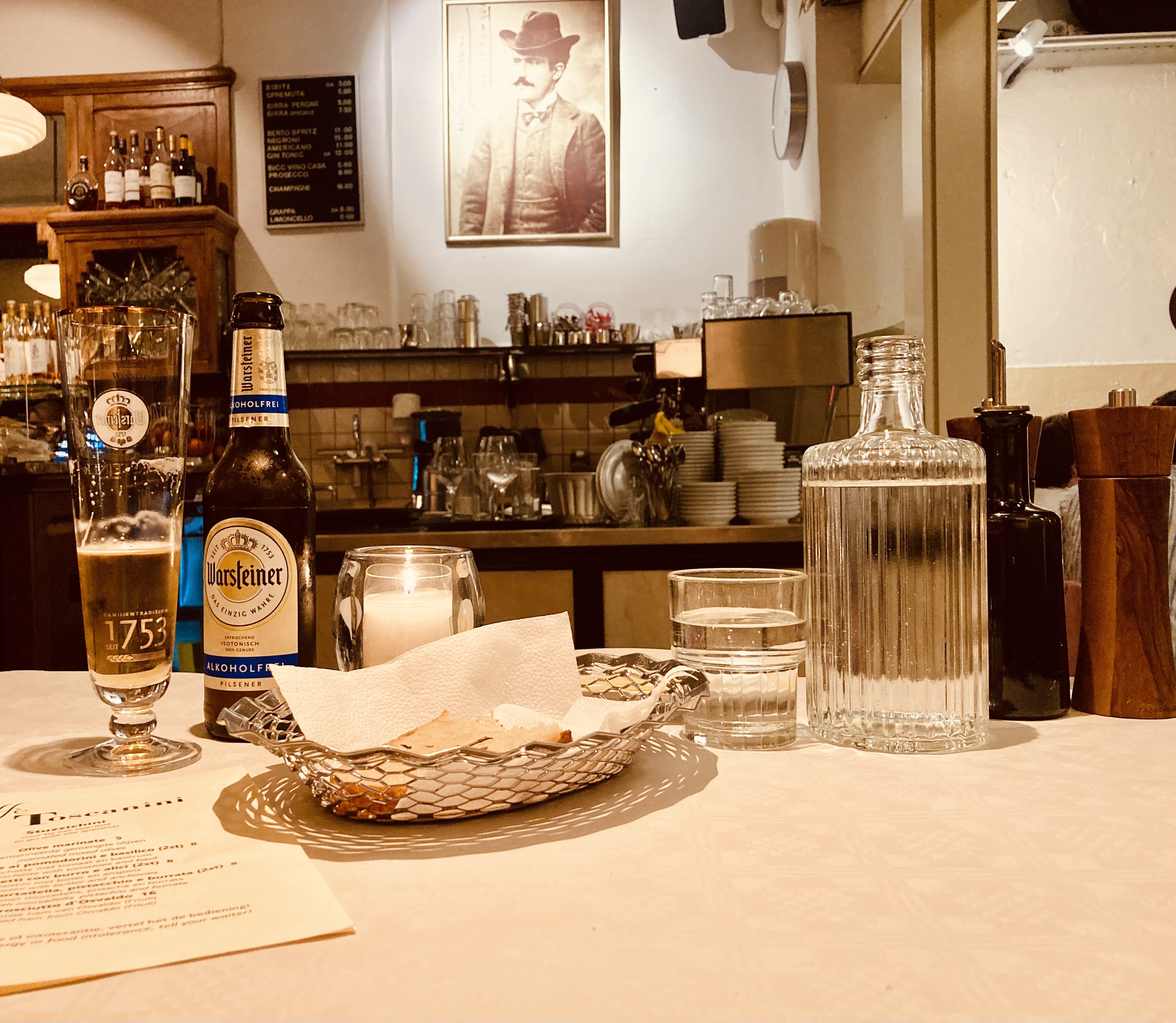 Caffé Toscanini (Lindengracht 75-79, 1015 KD) Menú italiano. Hasta el momento, éste es mi Top 1 en la Lista de Kortekaas. Después de que me rechazaran por falta de lugar para uno en Café Parlotte, me fijé en mi lista de pendientes en mi Google Maps y estaba a escasos minutos en bicicleta de este lugar. Era miércoles, entré por la doble puerta, y esperé al lado de la barra y ver si tenía mejor suerte. Afortunadamente, me ubicaron en una de las mesitas situadas antes del salón principal. Me encantó ese espacio porque podia ver quién entraba y salía. Para tomar, pedí una Warsteiner sin alcohol, y me trajeron agua (gratuita), pan casero y aceite de oliva. Una de las chicas me enumeró los especiales del día y me tenté con la entrada ‘Carne Cruda’, una especie de tártaro/carpaccio con burrata y tempura de zucchini, que estaba exquisito. De principal, estaba en una disyuntiva entre dos platos, ya que me encanta el pulpo, pero le tenía miedo a la descripción del plato: Calamarata con polpo piccante, por lo que le consulté a la camarera que tan picante era… Me aseguró que tenía cierto picor, pero no mucho, «nada que ver con el picante asiático» me dijo… Tendría que haberme decidido por el otro plato, ya que, luego de un primer bocado de la pasta al dente, mi garganta ardía de lo picante que estaba. Mala mía, tengo que dejar de confiar cuando me dice: ‘No, no es muy picante‘, porque para mi paladar es un fuego. Lamentablemente no lo disfruté, a pesar de que rescato la cocción y el sabor, y que los pedazos de pulpo eran generosos. A pesar de este detalle con la comida, la pasé muy bien. El ambiente era bulliciosamente alegre, y mientras estaba ahi sentada cómodamente, pensé en que me gustaría volver con amigos y después de la Copa América, cuando ya me permita acompañar una buena cena con una botella de vino. Los detalles de la decoración te llevan a la bella Italia y a su legado gastronómico, histórico y cultural. Me hubiera encantado probar un postre, pero hubiera sido un exceso. Pedi la cuenta (€44.50+propina), saludé al amable chico que estaba en la barra y me devolvió mi impermeable colgado al entrar.