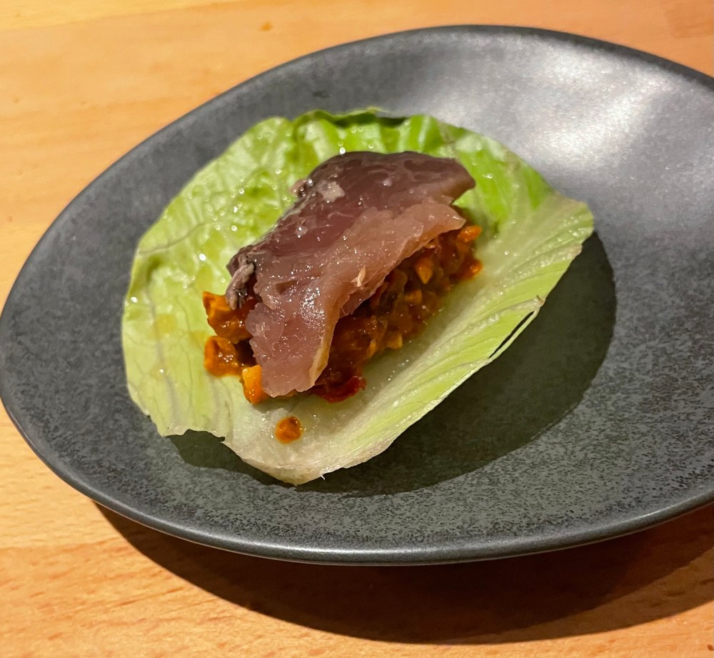 Otro día me dije, voy a ir a Contracorrent. Aunque iba con miedo a que me rebotaran, porque imaginé que siendo un menú de pasos, solamente aceptarían comensales con reservas. Entonces fui temprano, entré al local vacío, pregunté si podía comer, aclarando que no tenía reserva, y me preguntaron si era yo sola. El chico se fijó en su lista y me dijo que podía darme mesa hasta las 21:30. Le dije que sí podían servir en ese tiempo el Menú Degustación Corto de cinco pasos – también tienen uno largo -, estaría agradecida.