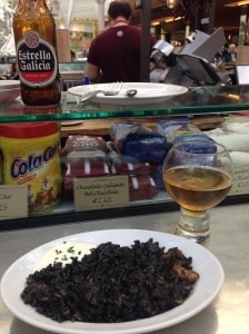 Arroz Negro con camarones y calamares servido con alioli
